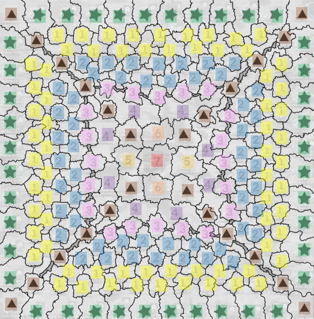 交易所争奪戦の開始前日に、翌日争奪可能となる交易所とその位置、レベルが公開されます。端的に言えば極地のような形で争奪していく形です。